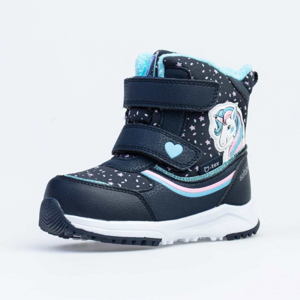 Ботинки из комбинированных материалов верха с использованием мембранной технологии. Комбинация технологий KTF-TEX и SOFT SHELL позволяют ножкам оставаться в тепле в любую погоду. Контрастная расцветка, усиление носочной и пяточной частей – все, для большего удобства и красоты. Подкладка - утеплённая, из шерстяного меха. Язычок ботинка вшит по бокам практически до самого верха, тем самым предотвращая попадание снега и воды внутрь. На ноге модель фиксируется с помощью 2-ух липучек, что придаёт ей максимальную раскрываемость и идеально подходит для ножек с высоким подъёмом. Подошва из комбинации материалов Филон и ТЭП не скользит и обладает повышенной износостойкостью. Особенно хороши для активных прогулок.Материал подошвы: Филон + ТЭП