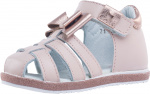 Комфортные сандалии с закрытым носом. Материал верха и подкладки - качественная натуральная кожа. На ноге модель фиксируется с помощью ремня с велькро. Закрытая пятка надежно фиксирует стопу. Мягкий манжет создает комфорт при ходьбе и предотвращает натирание ножки ребенка. Стелька из натуральной кожи имеет небольшой подсводник.Подошва из термоэластопласта - легкая и удобная, имеет блестящий декоративный рант. Модель декорирована бантом из натуральной кожи.